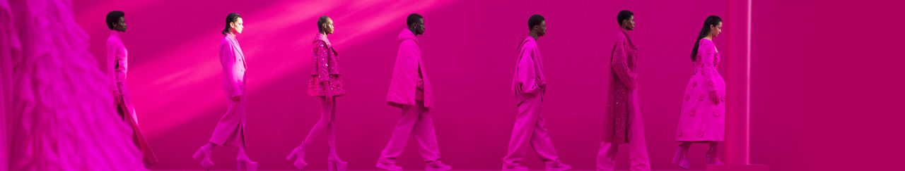 Самым известным примером ярко-розового безумия стала коллекция Pink PP от Valentino, которая дебютировала на показе мод Осень/Зима 2022/2023, во время Недели моды в Париже, где почти каждый образ был исключительно посвящен цвету. Актриса Зендая, как лицо бренда, пришла на показ также в ярко-розовом брючном костюме.